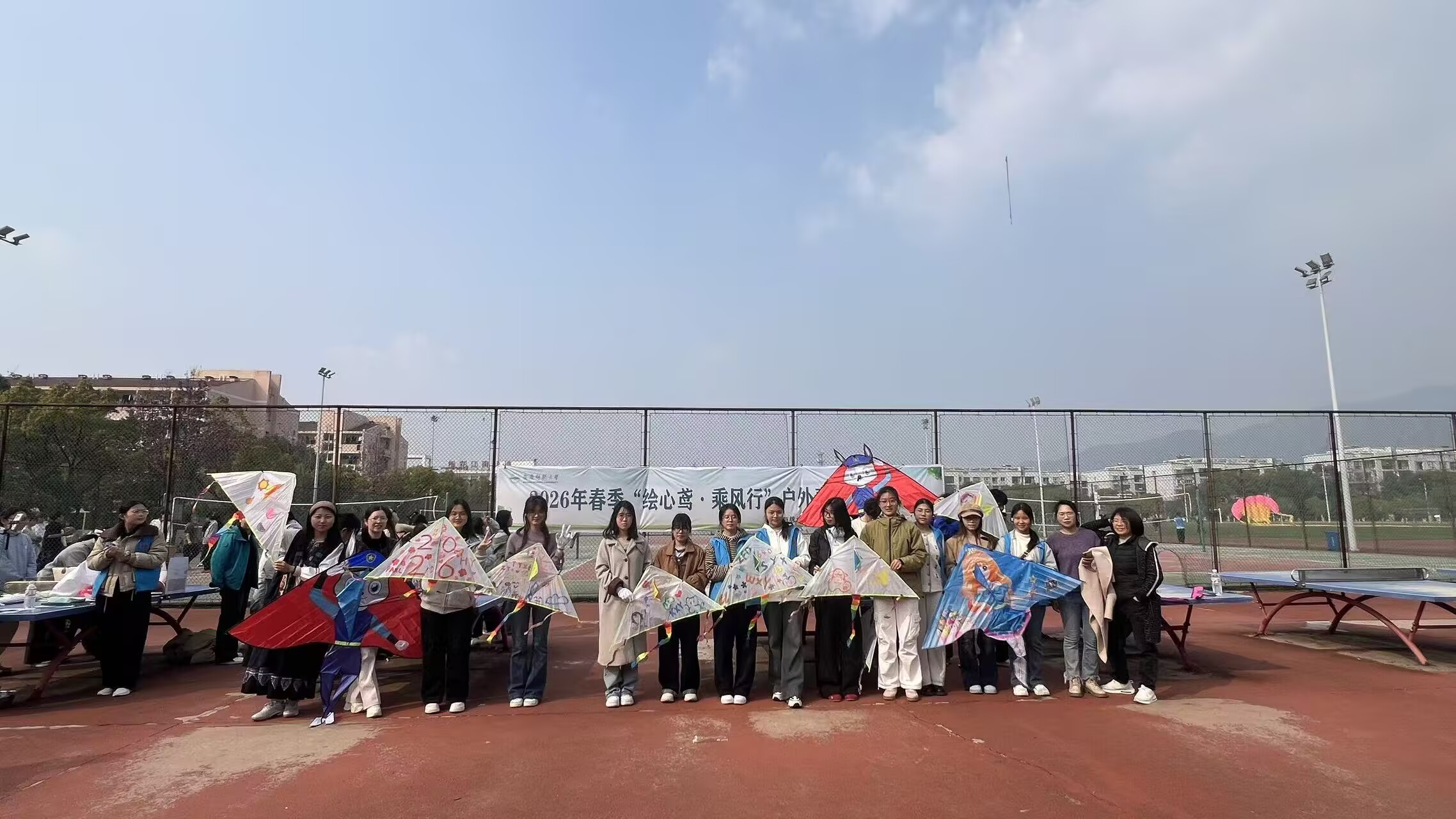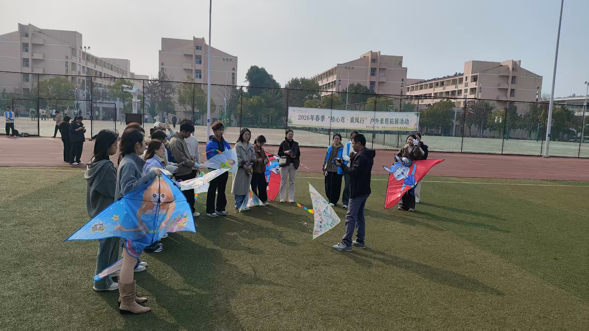 3月12日,数学与统计学院、物理与天文空间学院在学校大学生心理健康教育与服务中心指导下,联合举办2026年春季“绘心鸢·乘风行”户外素质拓展活动。近百名师生齐聚龙山校区东门运动场操场,在春日暖阳之下,以七彩风筝为介,放飞青春梦想。