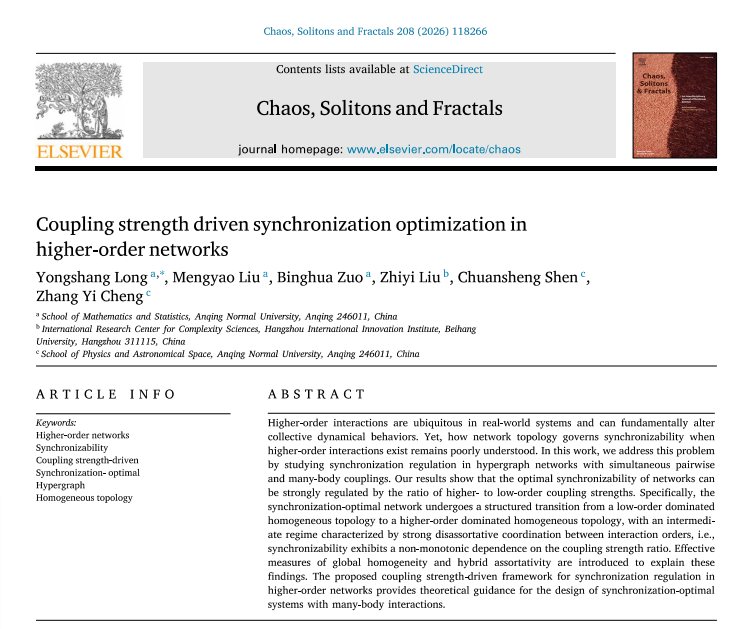 近日,数学与统计学院龙永尚博士团队在国际学术期刊《Chaos, Solitons and Fractals 》上发表论文“Coupling strength driven synchronization optimization in higher-order networks”。龙永尚博士为第一作者和通讯作者,安庆师范大学为第一单位,该期刊影响因子IF=5.6,JCR一区,中科院一区TOP期刊。