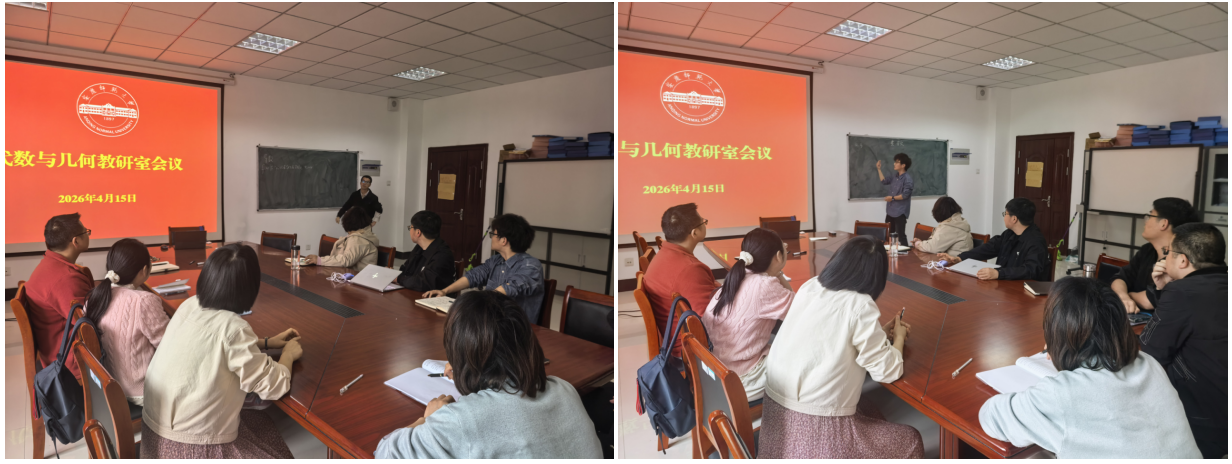 4月15日下午,数学与统计学院代数与几何教研室在I楼407会议室举办了青年教师讲课磨课活动。本次活动由青年教师王健博士和沈百年博士主讲,教研室全体教师到场观摩,并参与评课研讨。