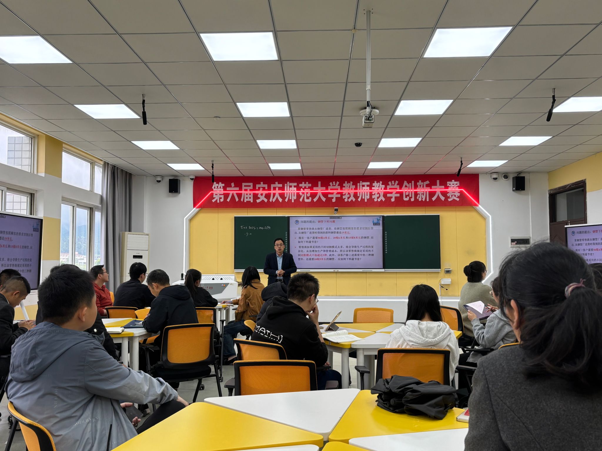 示范课上,王拥兵教授以《钢管下料问题》为主题,呈现了一堂精彩的数学建模实践课。王教授以工业生产中的实际下料场景为切入点,通过具体的生产需求与数据,探讨“如何在满足订单需求的前提下,最大化减少原料浪费”这一核心问题,将抽象的建模思想与现实应用场景紧密结合。随后,他循序渐进地完成问题分析、变量定义、约束条件梳理、目标函数构建等建模全流程,详细讲解了整数规划模型的建立思路与求解方法,并结合生产实际对模型进行了优化与拓展。课堂上,王教授注重启发式教学,通过层层递进的提问引导,提出不同的建模思路,充分展现了数学建模课程“从实践中来、到实践中去” 的教学特色。