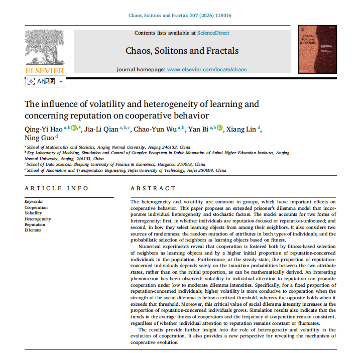 近日,数学与统计学院郝庆一教授团队在国际学术期刊《Chaos, Solitons and Fractals 》上发表论文“The influence of volatility and heterogeneity of learning and concerning reputation on cooperative behavior”。郝庆一教授为第一作者和通讯作者,数学与统计学院吴超云副教授、毕艳博士为论文合作者,安庆师范大学为第一单位,该期刊影响因子IF=5.6,JCR一区,中科院一区TOP期刊。