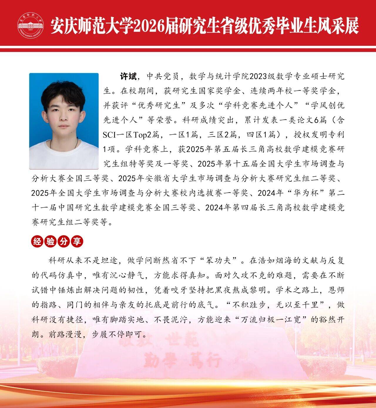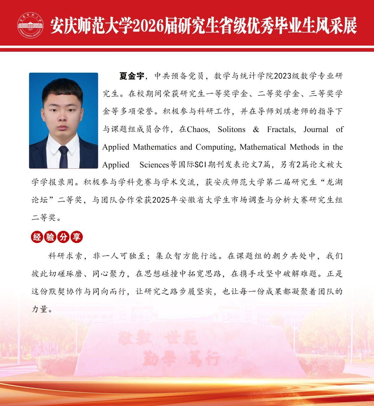 此次风采展,既是对优秀学子的肯定,更是对全院研究生的激励与引领。愿全院学子以榜样为镜、向标杆看齐,传承 “严谨致精、求实鼎新” 的院训精神,在数海星河中锚定方向、潜心耕耘,逐梦远航,让青春在不懈奋斗中绽放绚丽之花!(撰稿:吴祥;审核:张海)