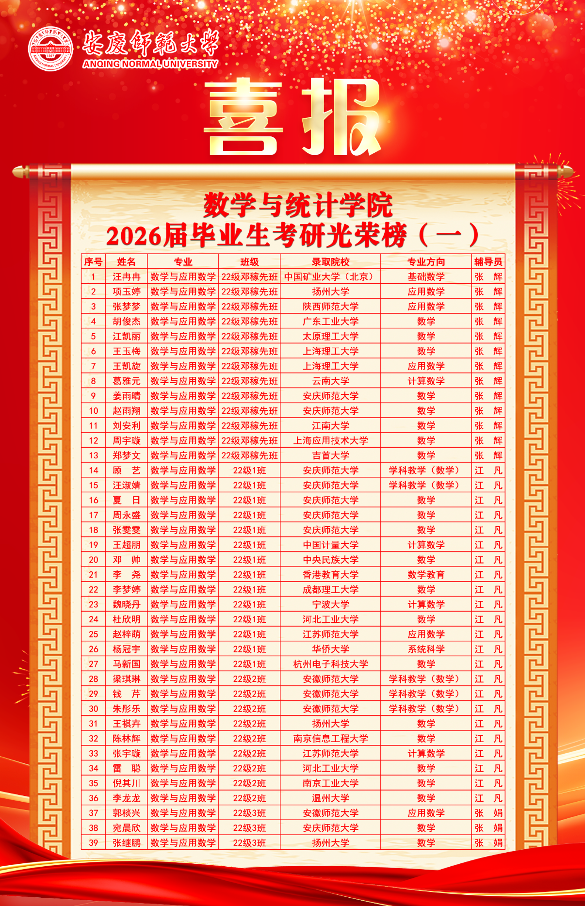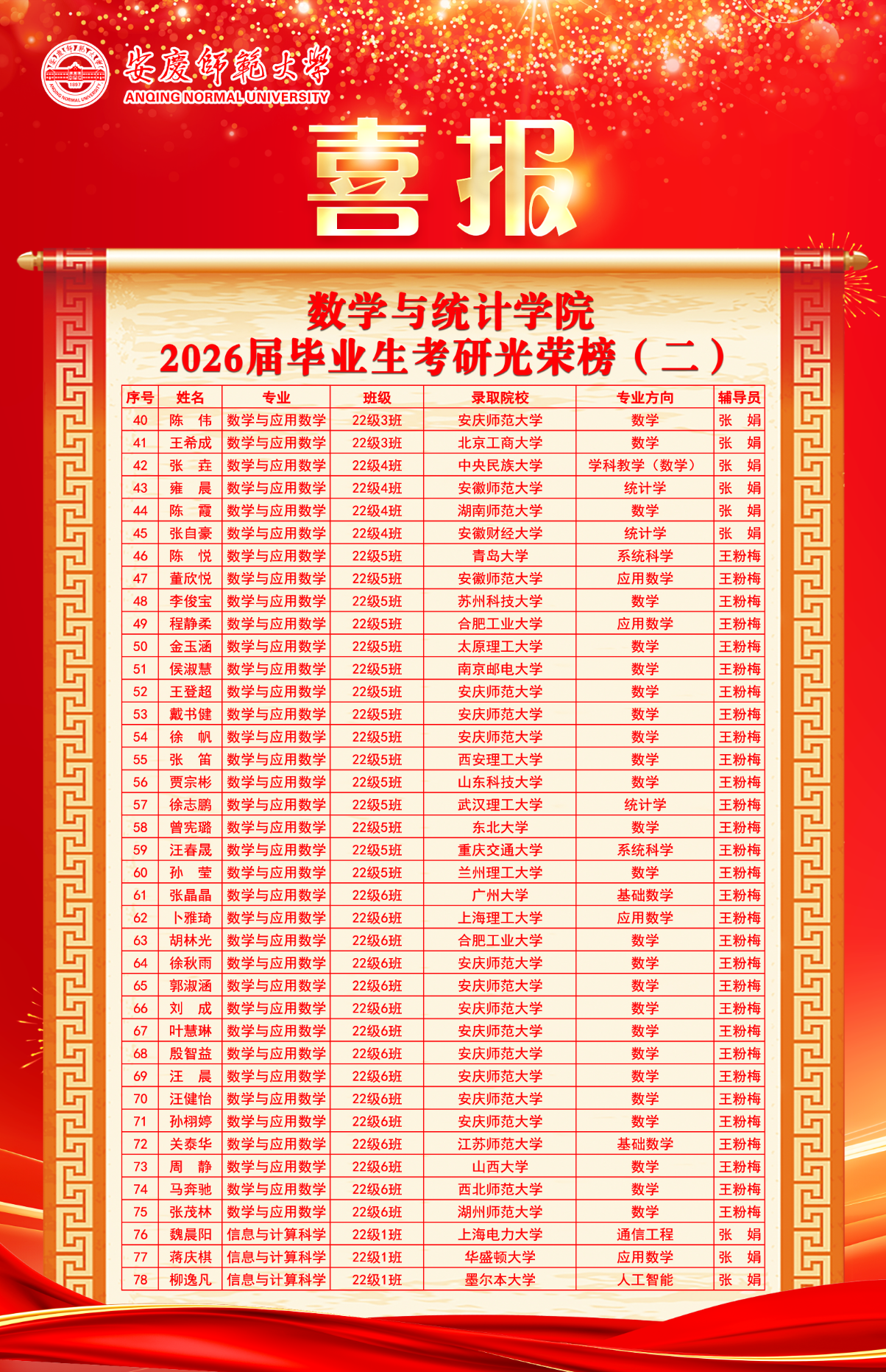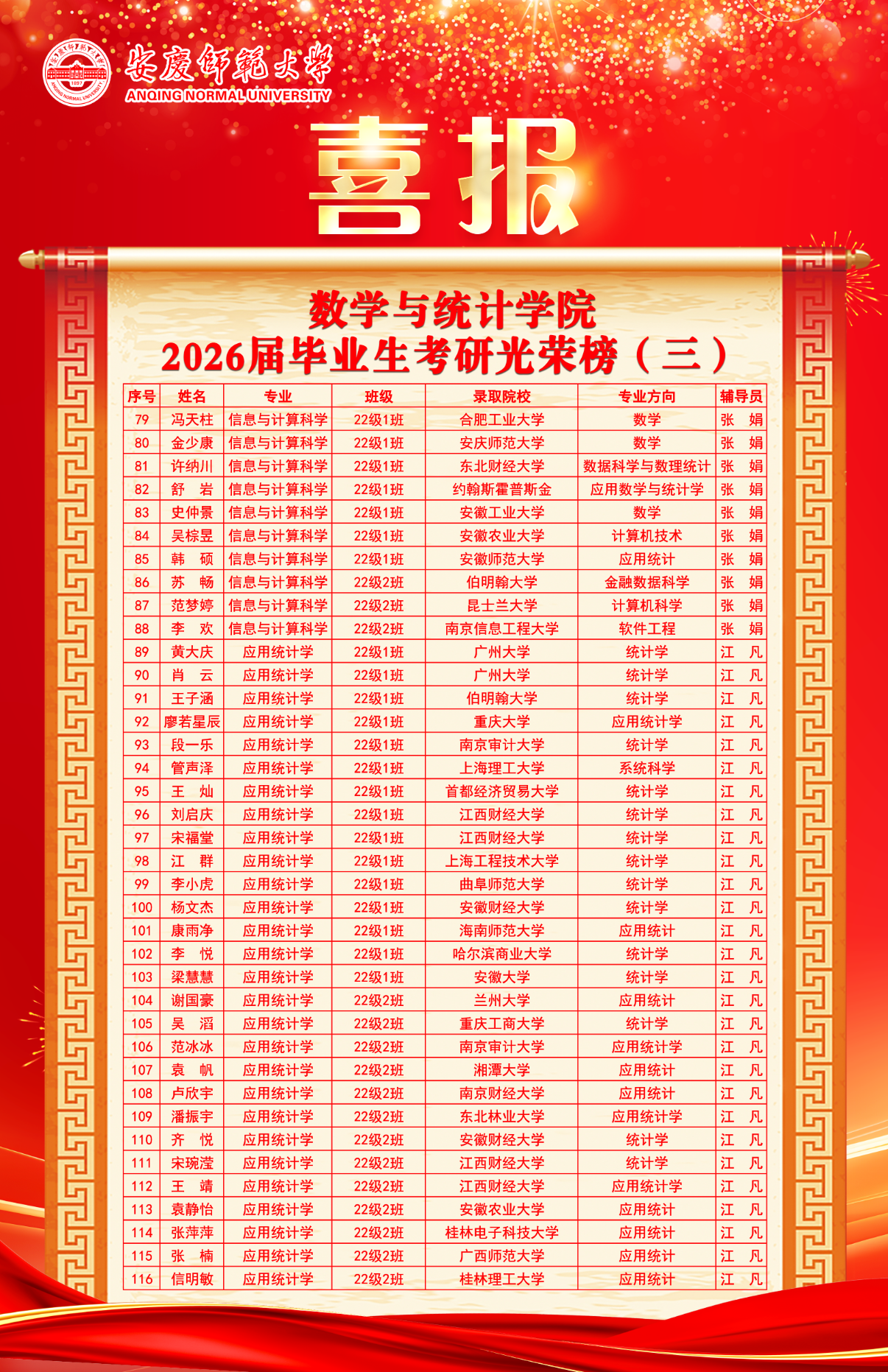 数学与统计学院2026届考研升学喜讯频传,116名优秀学子凭借不懈拼搏,成功录取至约翰斯・霍普金斯大学、墨尔本大学、昆士兰大学、伯明翰大学、华盛顿大学等世界名校及国内多所重点高校,用实力书写青春答卷,为学院人才培养增添荣光。