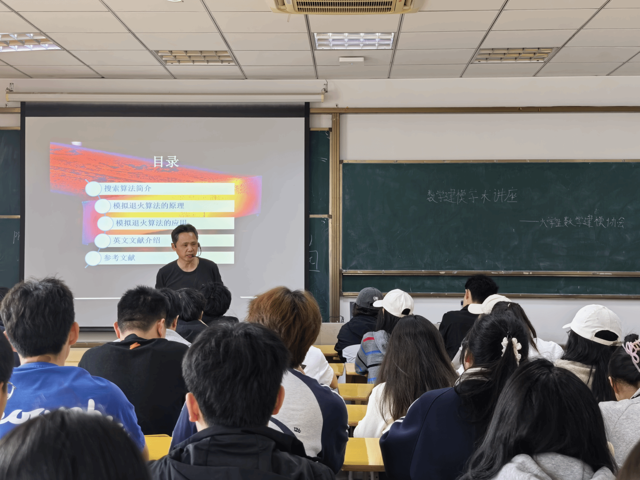 陈逢林老师以《智能优化算法的原理与应用》为题,介绍了模拟退火、遗传算法、粒子群算法等启发式方法在复杂优化问题中的优势,重点讲解了模拟退火算法的数学原理、流程与代码实现。结合2023年与2025年全国大学生数学建模竞赛A题,他分析了算法在“定日镜场优化设计”和“烟幕干扰弹投放策略”中的实际运用。讲座历时两个多小时,同学们就算法编程与建模应用进行了交流。