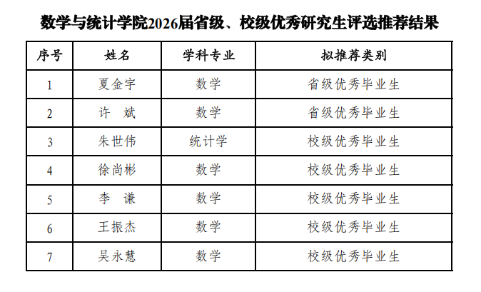 根据学校《关于做好2026届省级、校级优秀毕业生评选工作的通知》精神,经研究生个人申请、学院学位评定委员会评审、学院党委会和党政联席会议审定,拟推荐夏金宇等7名研究生分别为省级和校级优秀毕业生人选,具体推荐结果如下: